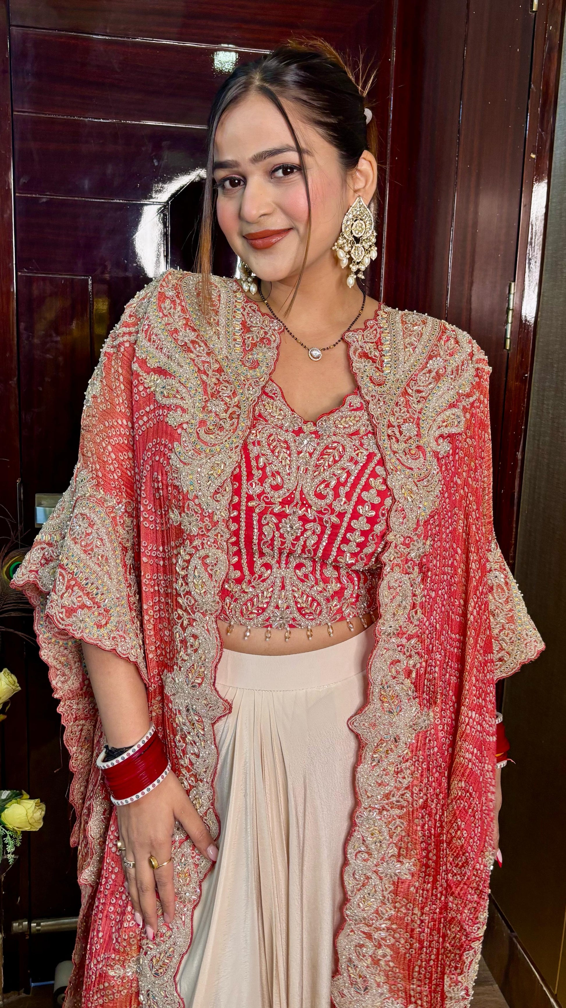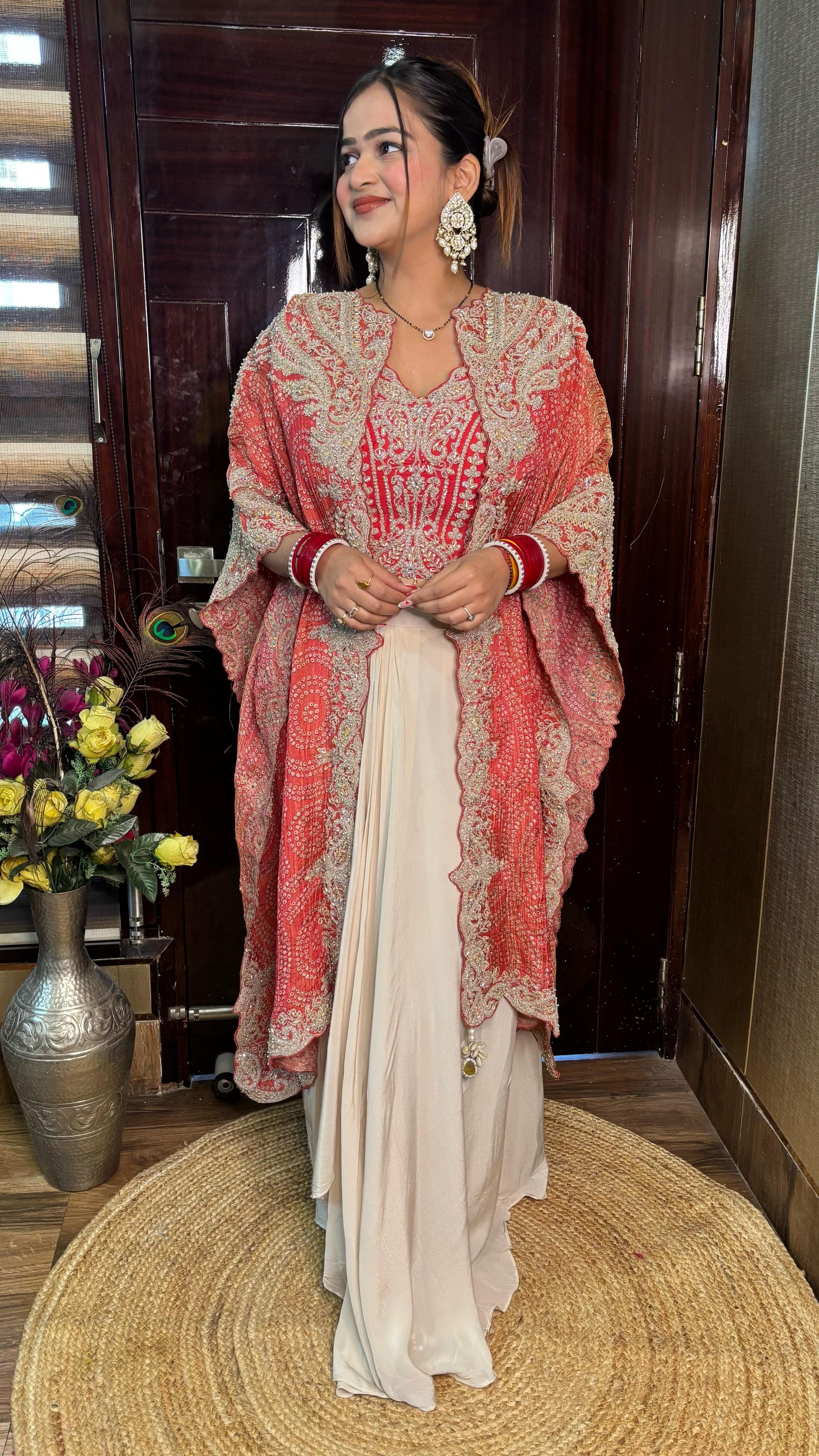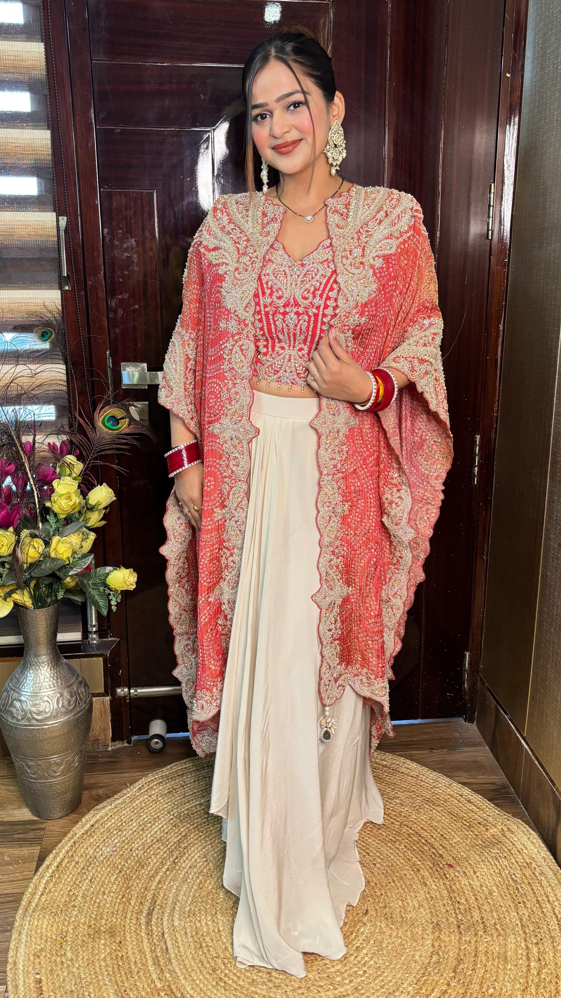 Fabric - Crushed Bandej Cape with Antique Handwork , Crepe Bustier+Skirt