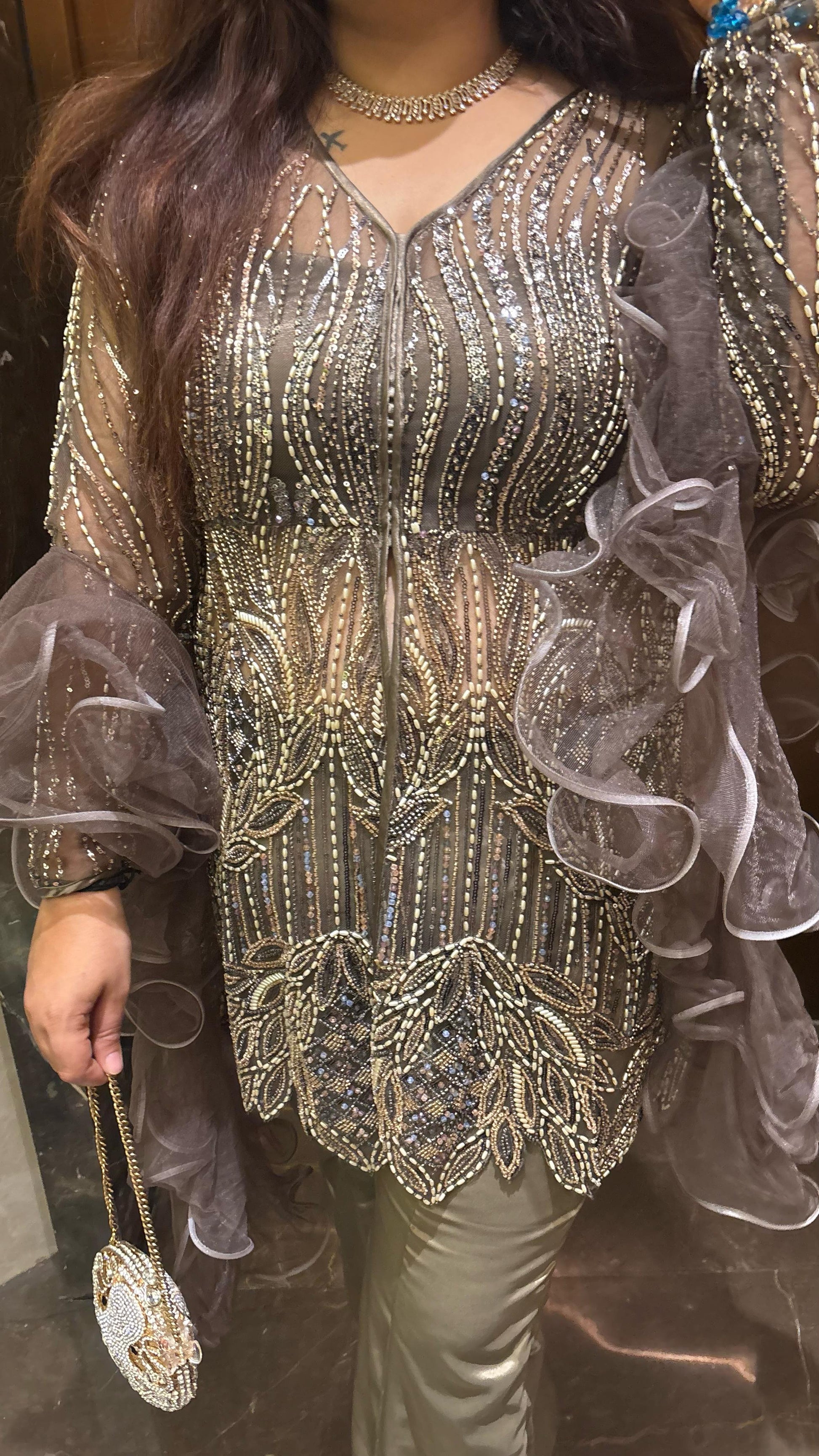 Elevate your style with Afreen, a 4 piece set featuring handwork detailing. Customize to your perfect fit and enjoy the unique bell bottoms and ruffle dupatta. Make a statement with this intricate and stunning ensemble.