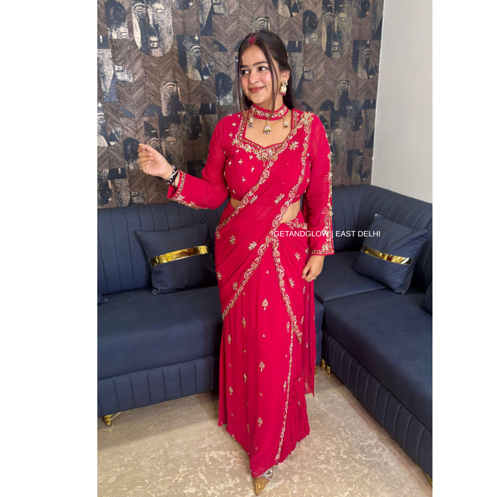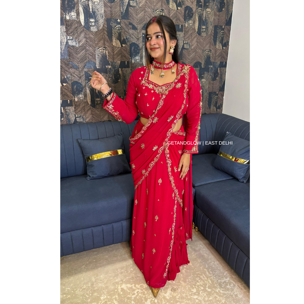 Elevate your style with the "APSARA" Designer Drape paired with an elegant choker necklace. This ensemble blends traditional charm with contemporary design, perfect for making a lasting impression at any special occasion. The drape’s graceful flow complements the intricate choker, adding a touch of sophistication and grace to your look. Step into the spotlight with this stunning duo that promises confidence and timeless elegance.