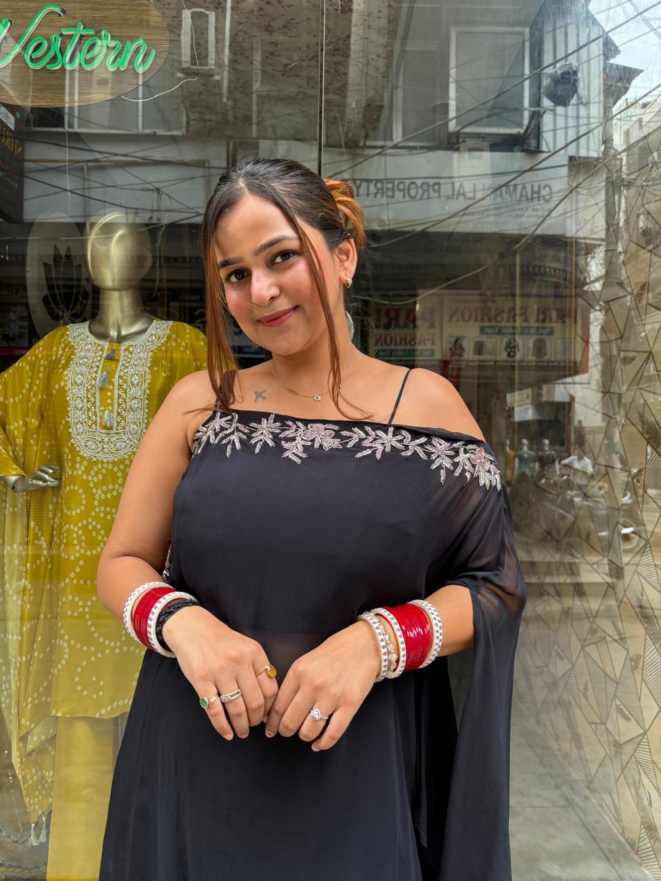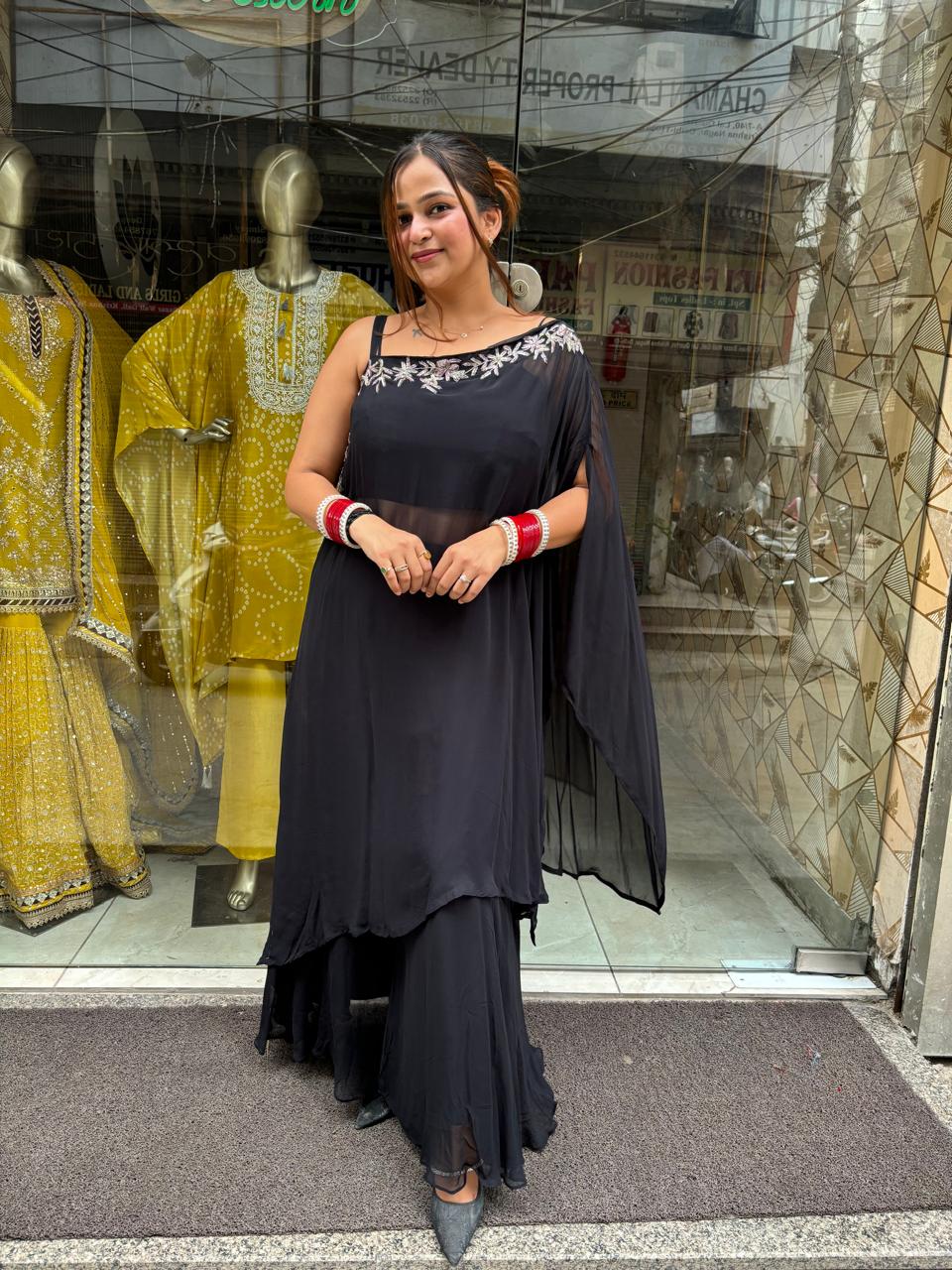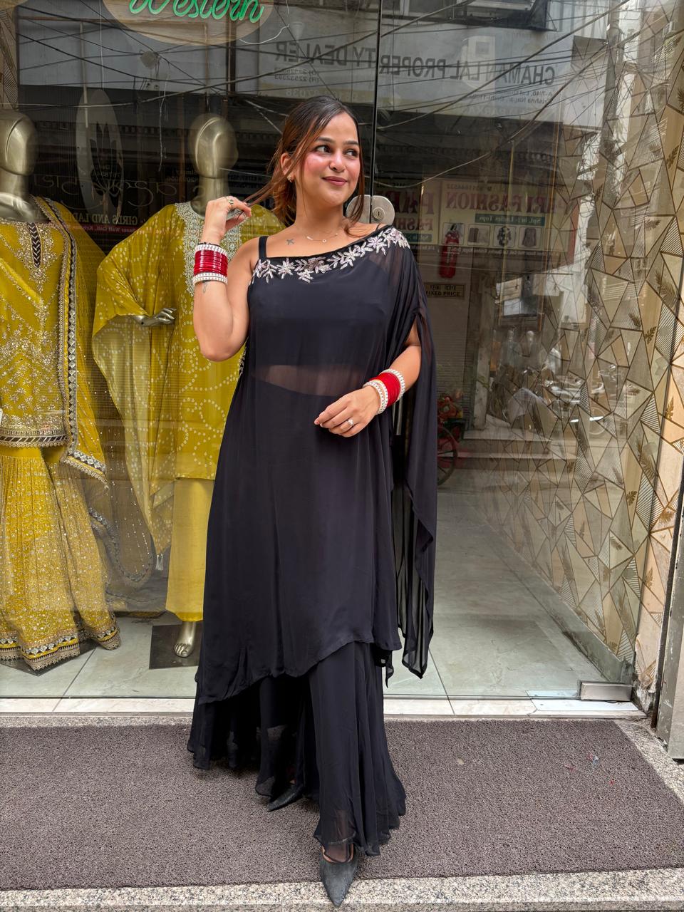 Made with premium georgette fabric and detailed with handwork, this 3-piece set includes a shrug, pants, and inner.