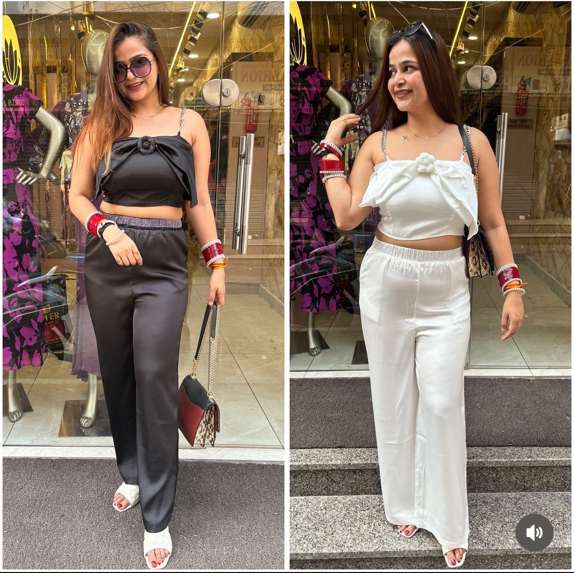 Made from luxurious imported fabric, this party wear set features a unique chain bow design that will make you stand out.
