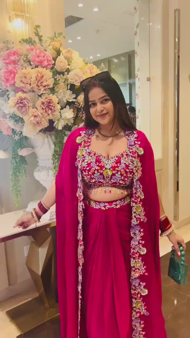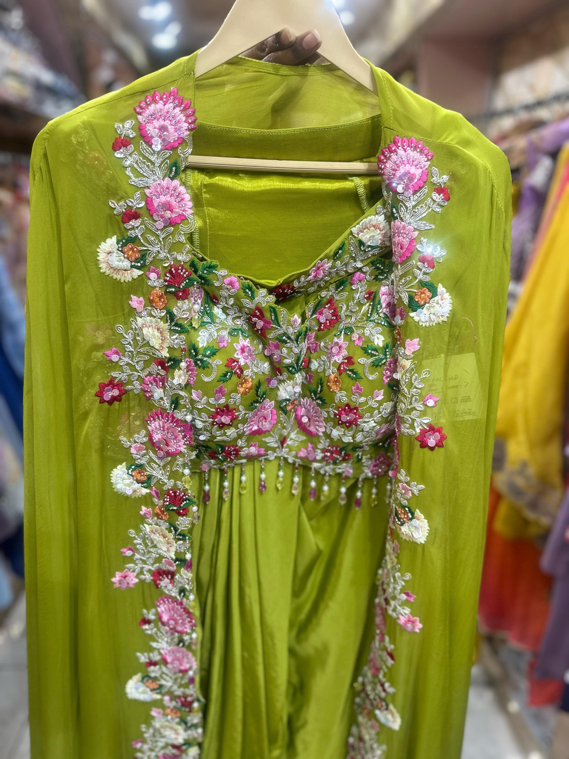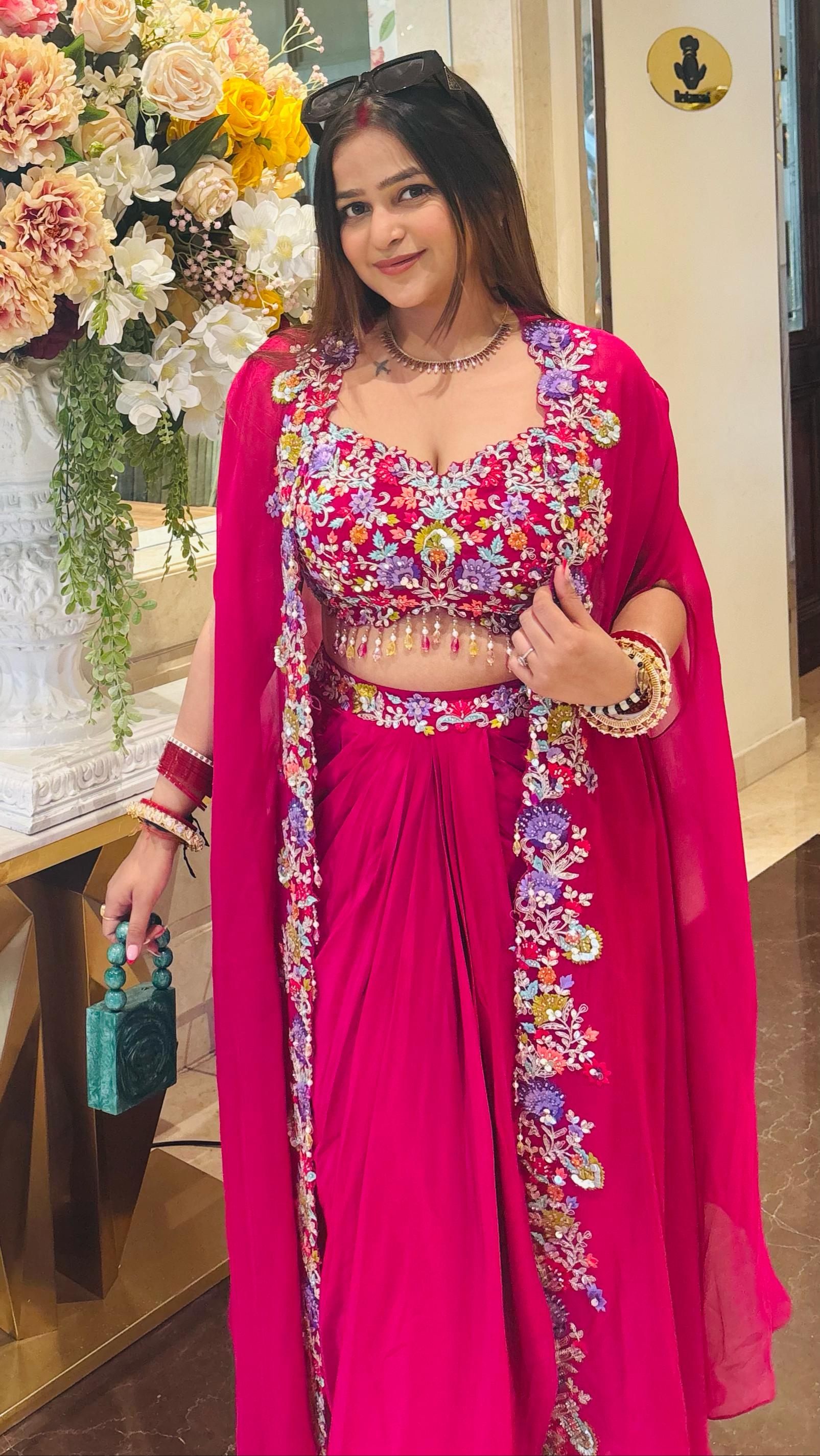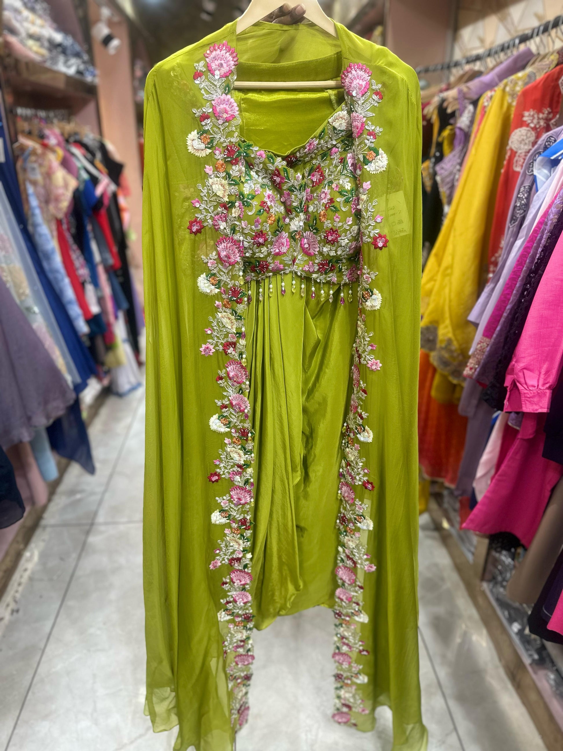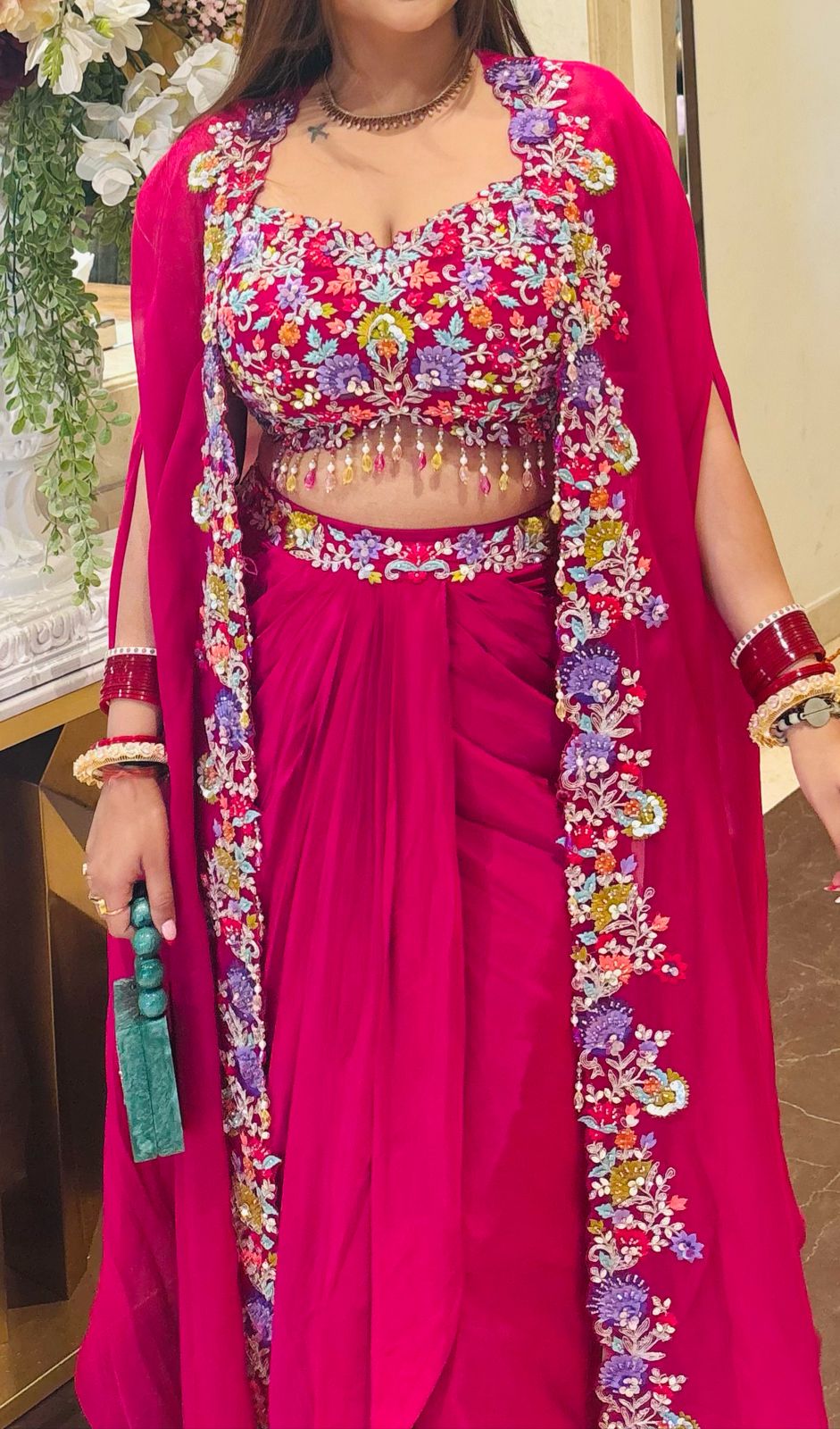 The DAISY 3 PIECE SKIRT SET is a stunning handwork designer article that includes a luxurious crepe skirt and an elegant orgenza cape. With intricate details and a designer touch, this set will elevate any wardrobe with its unique and stylish look. Make a statement with the DAISY 3 PIECE SKIRT SET!