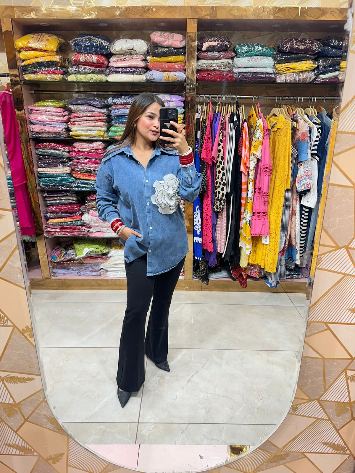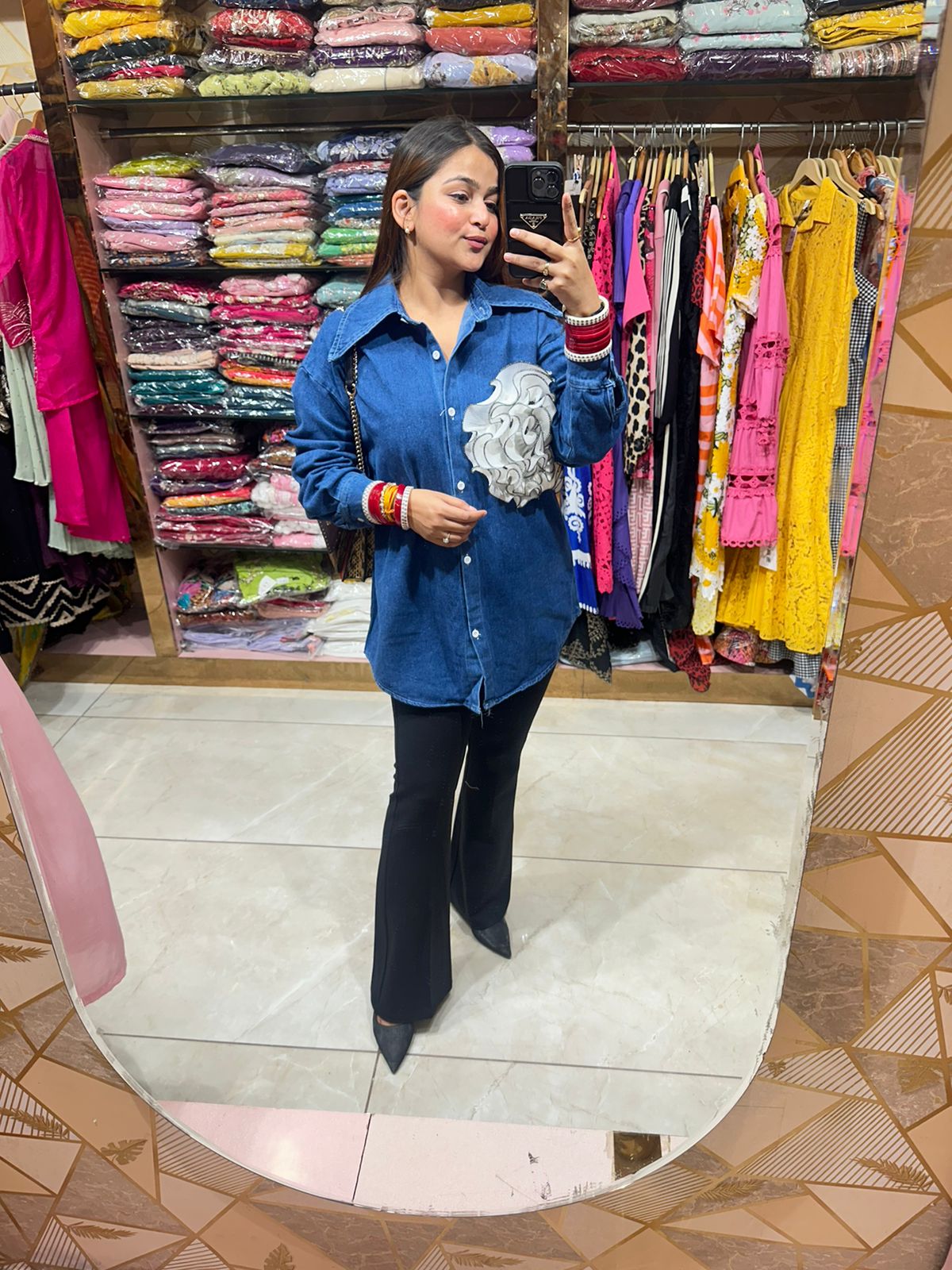 Made with imported denim of the highest quality, this shirt exudes trendy style. The model is wearing a size M, showing off the perfect fit and most stylish look of the season.