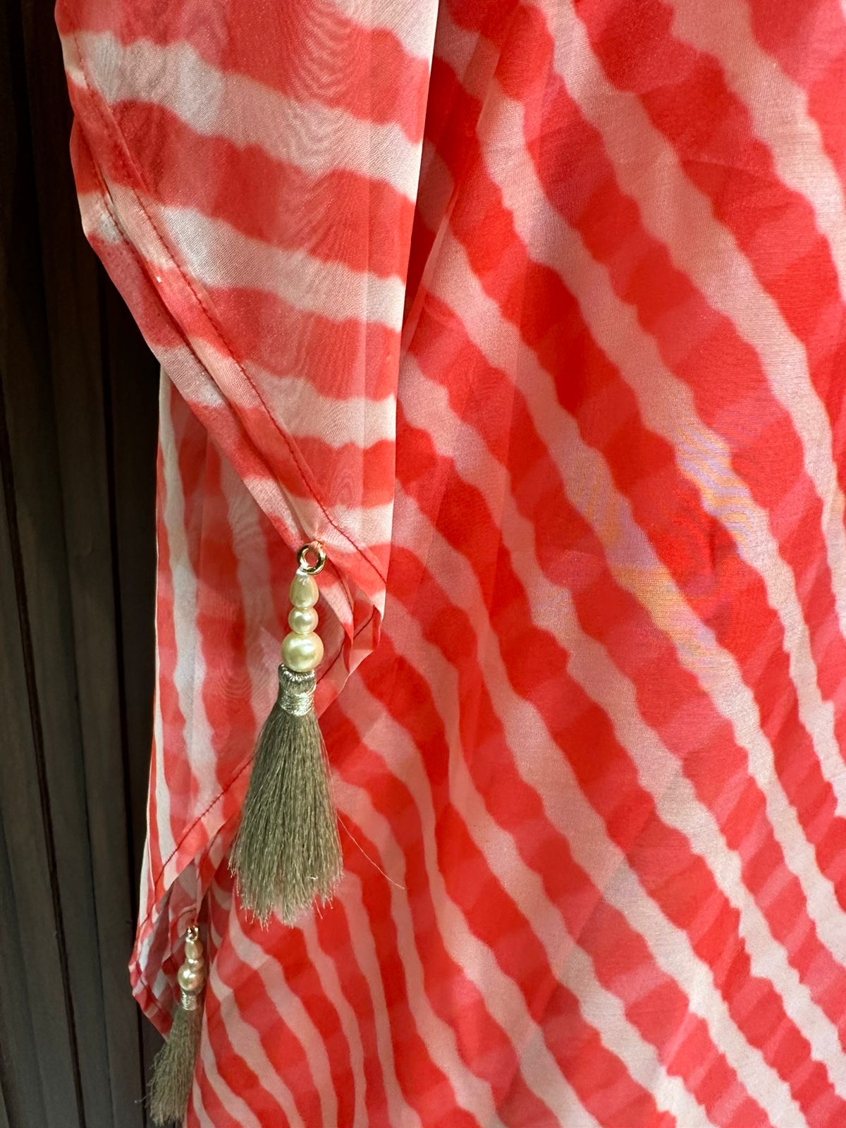 Made from a luxurious orgenza material, this kaftan set includes a beautiful pearl tassel detail for added elegance. T