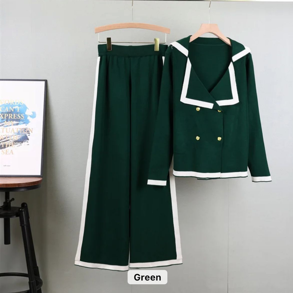 Elevate your winter wardrobe with our Elegant Double-Breasted Contrast Trim Knit Cord Set.