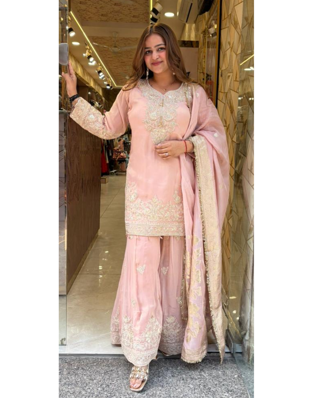 - shimmer tissue fabric, zari handwork plazo, banarsi dupatta.