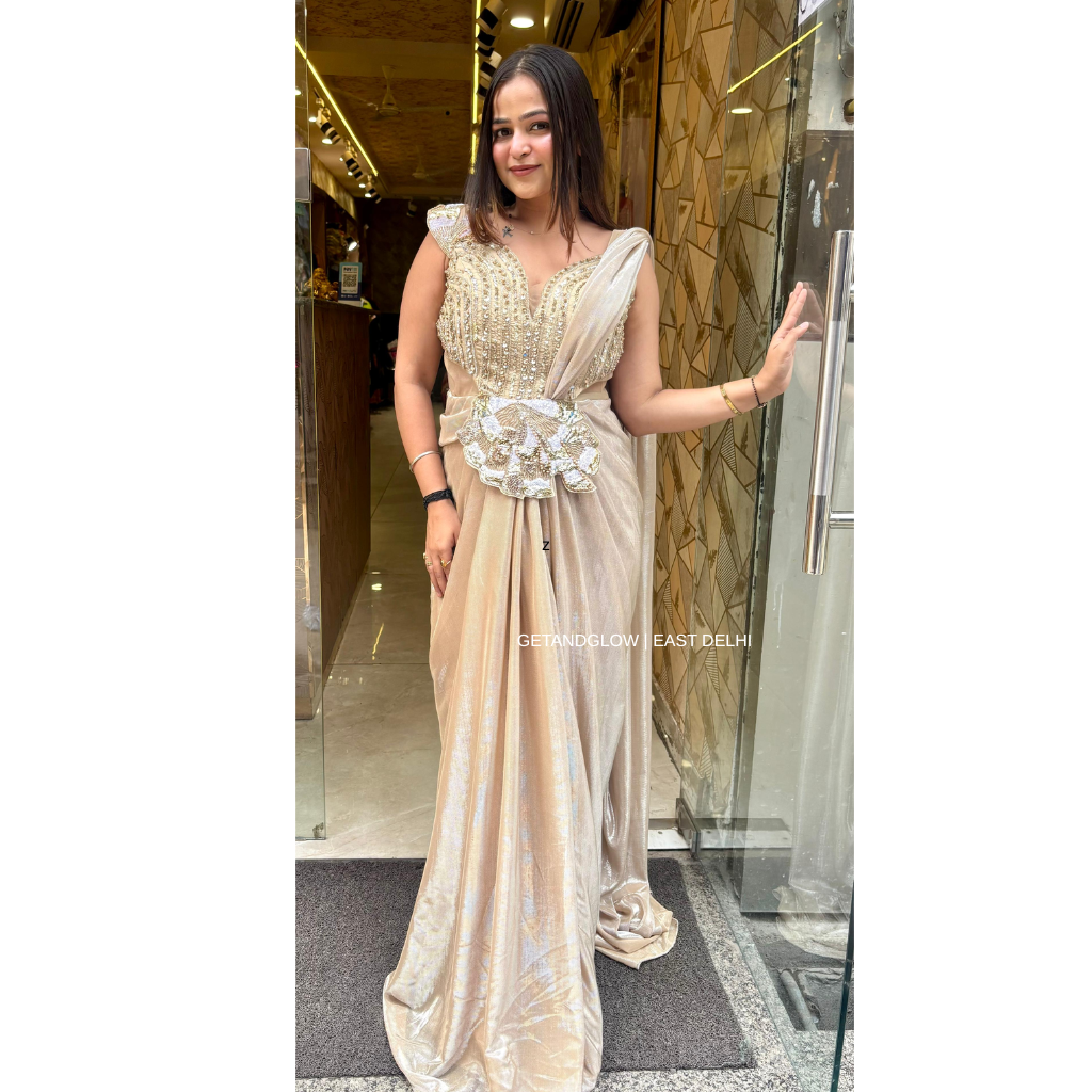 Elevate your style with the "JANVI" Designer Drape, a perfect blend of elegance and contemporary flair. Crafted to make you stand out, this drape adds a sophisticated touch to any occasion. Its graceful fall and exquisite design enhance your silhouette, making it a versatile addition to your wardrobe. Choose "JANVI" for effortless charm that captivates at every glance.