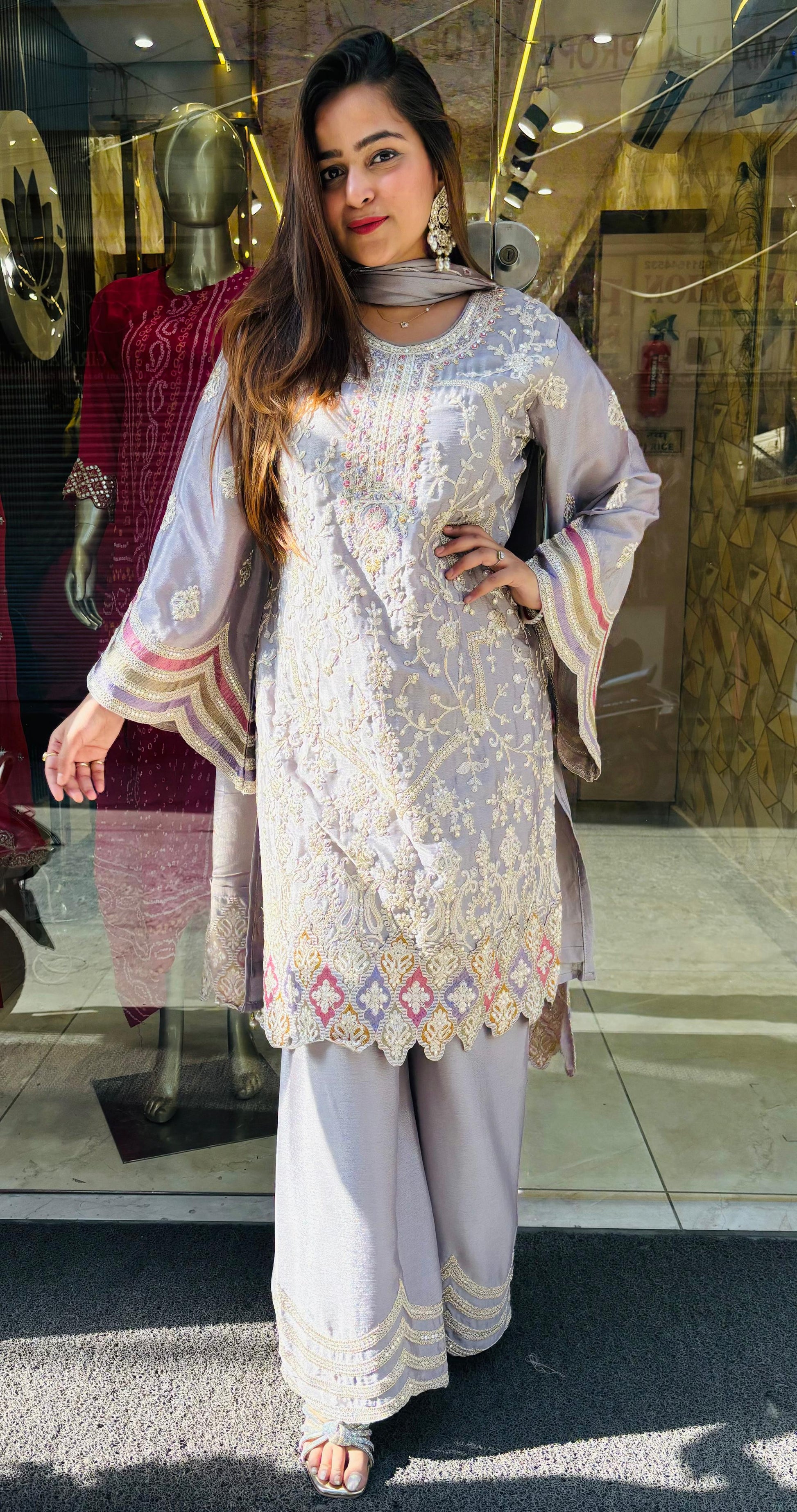Made with luxurious chinnon fabric, this partywear suit is designed to make you stand out in the crowd.