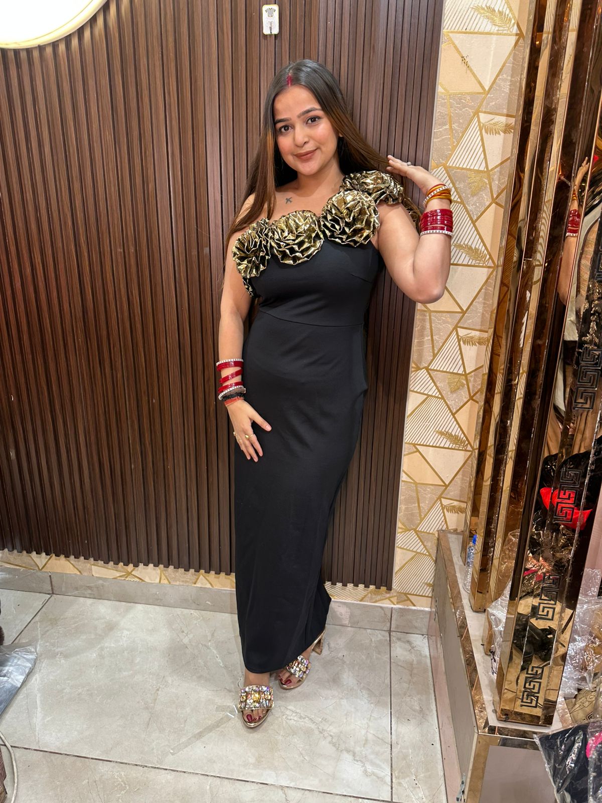 Get ready to shine and stand out at any party with our imported Mettalic Flower Dress!