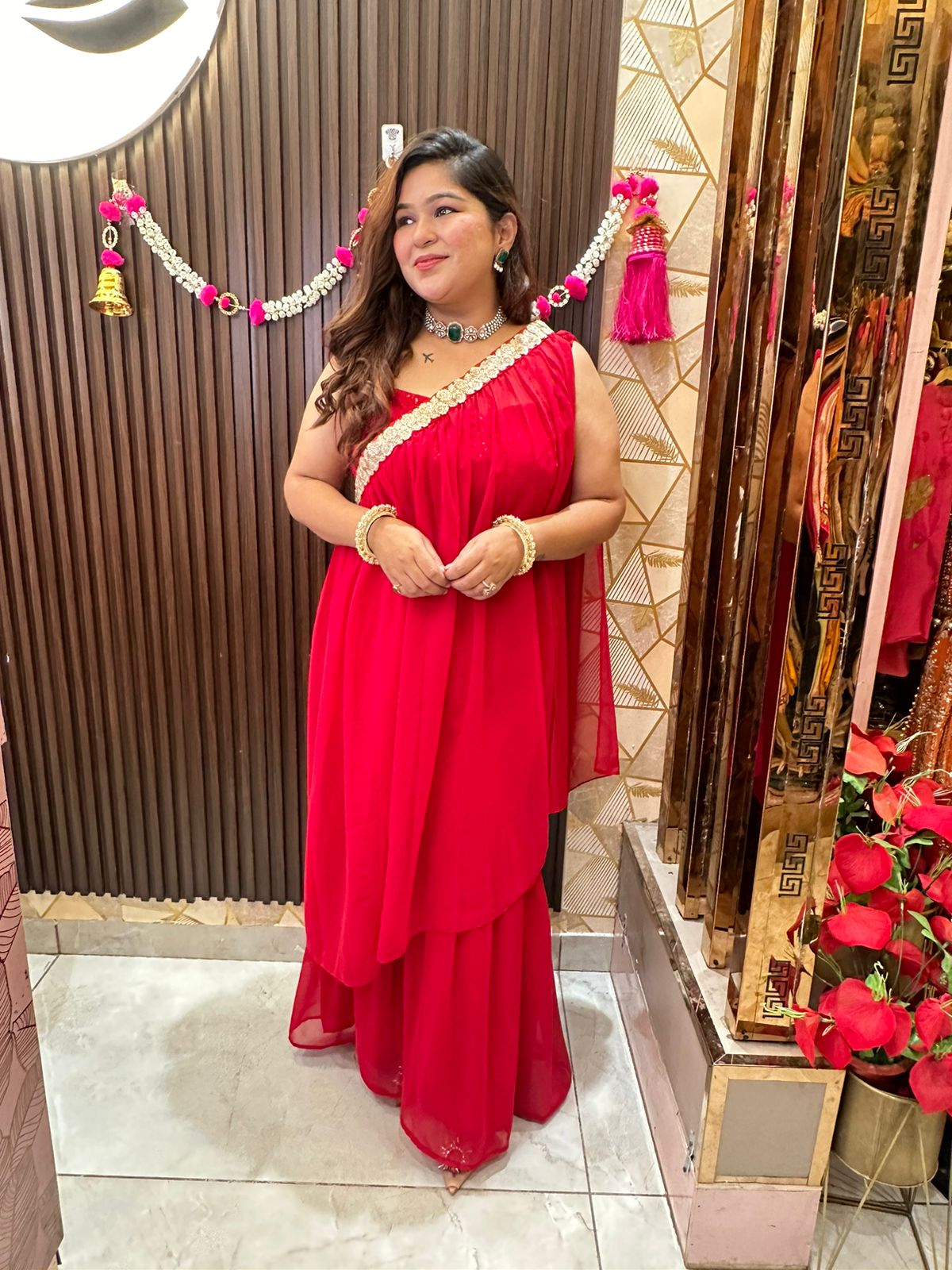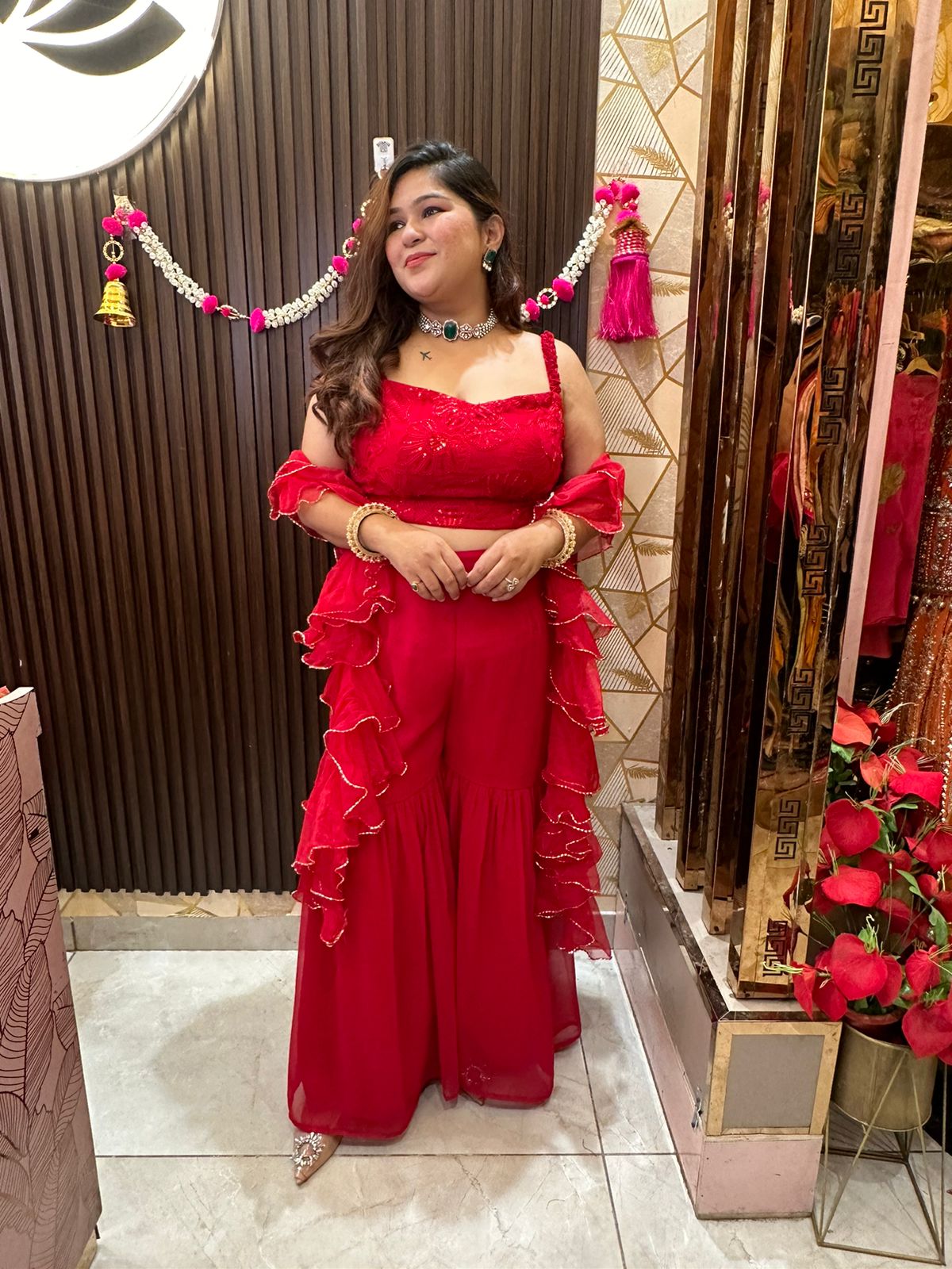 This stunning set features a fabricated blouse, georgette flare sharara, and a one-sided cape.