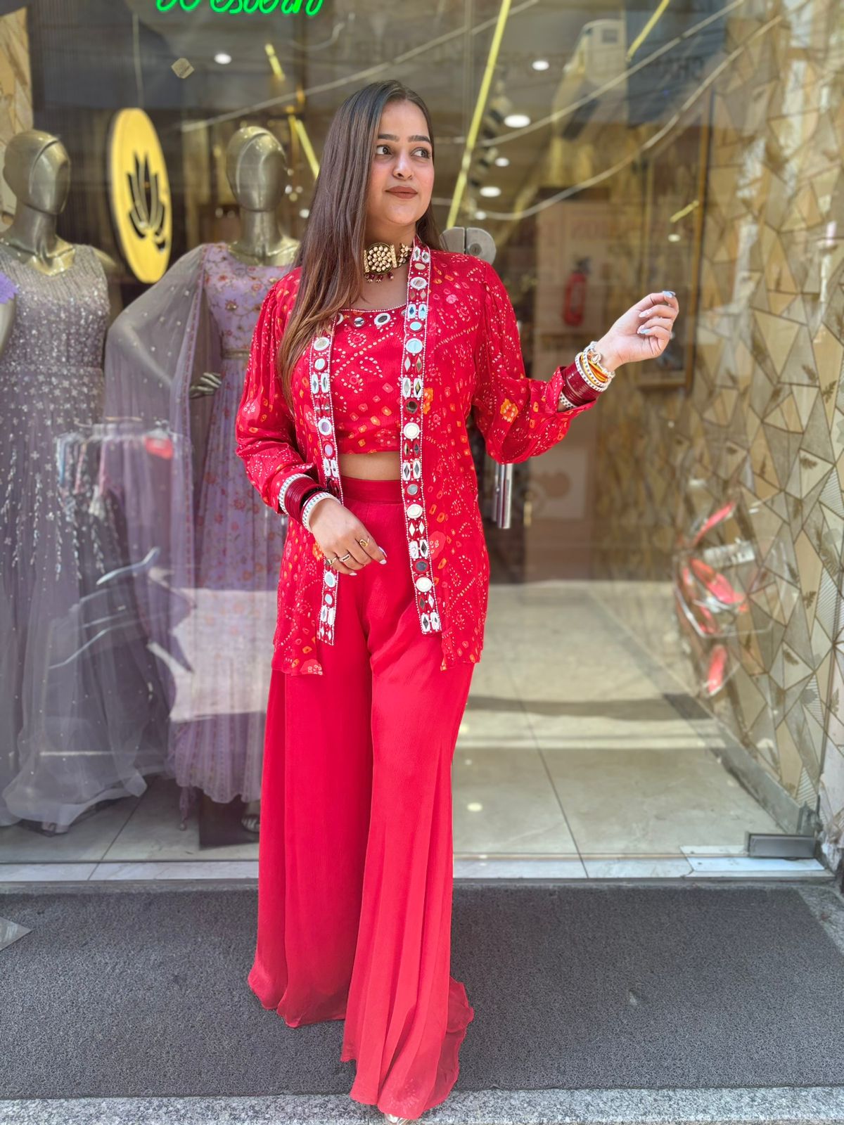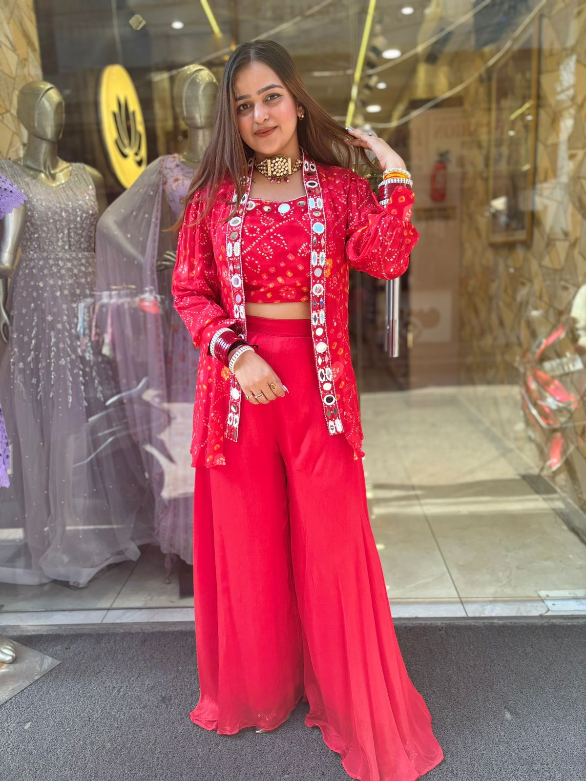Made with luxurious chinon fabric and adorned with intricate handwork of mirror detailing , this set is perfect for all occasions.