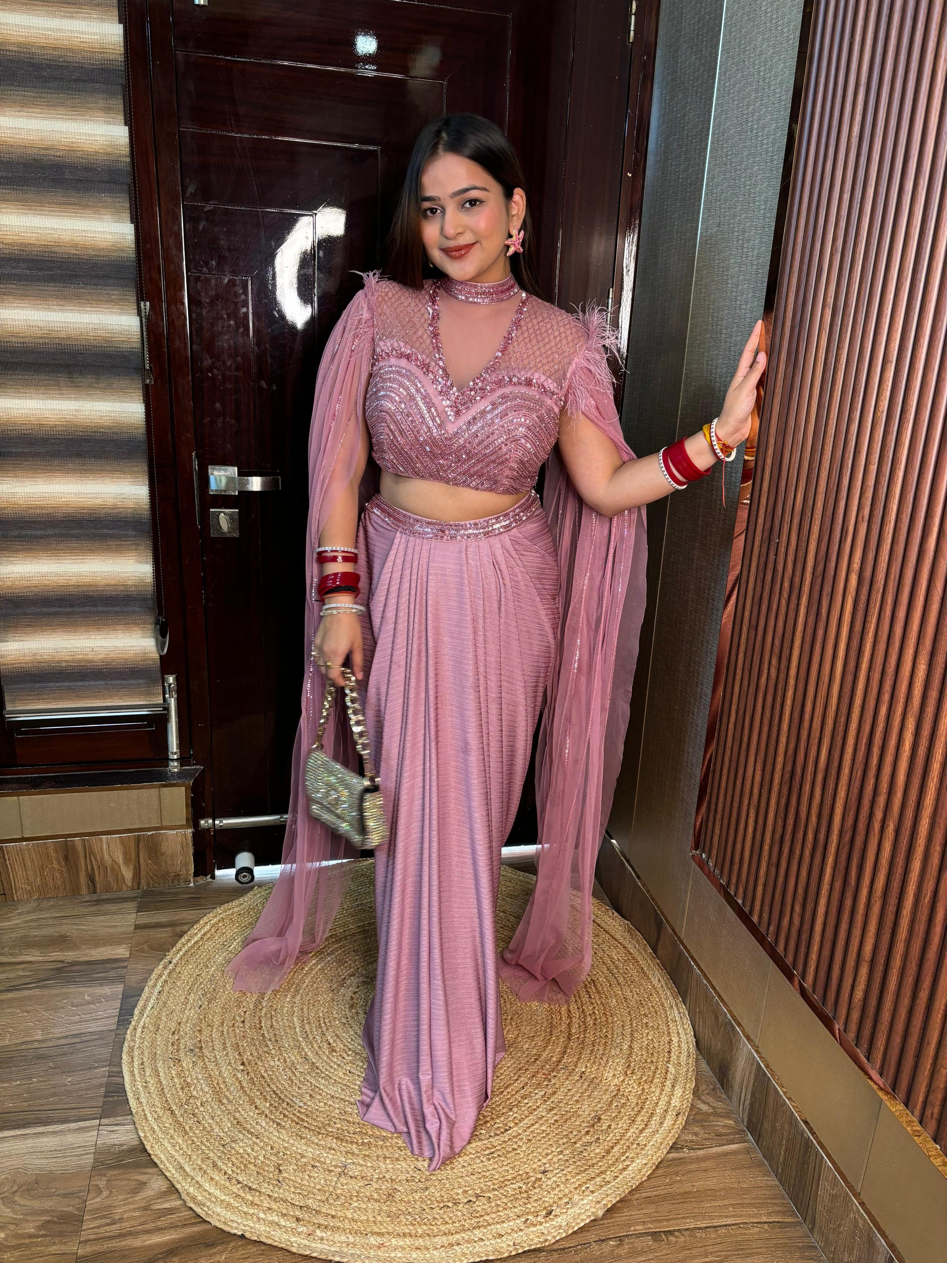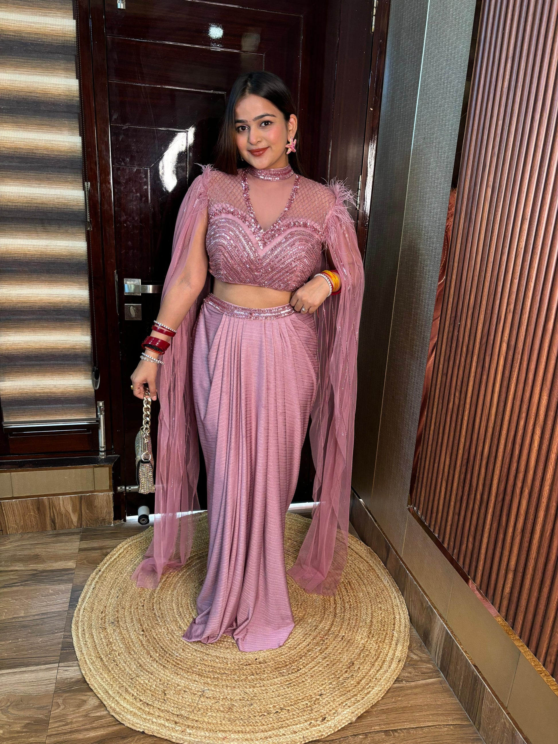 Perfect for events, this indowestern outfit features a handwork blouse adorned with delicate feathers, paired with a pleated skirt.
