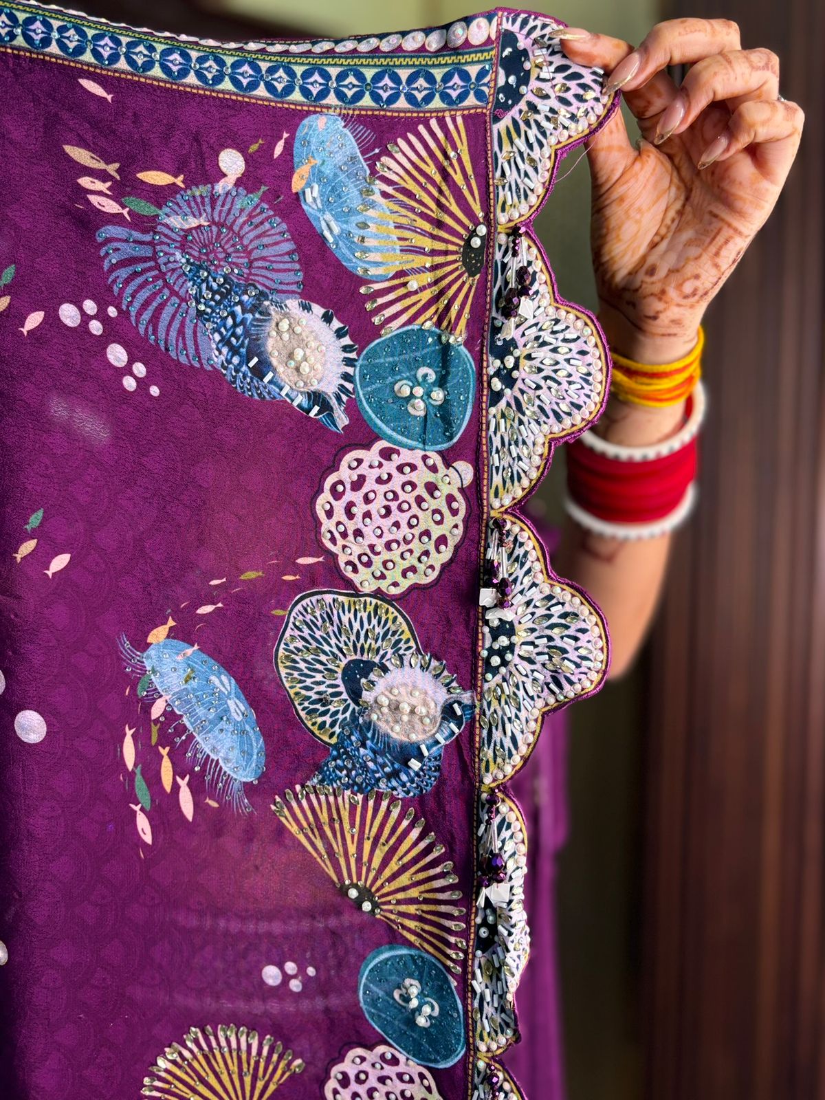 Made with high-quality crepe pure fabric and adorned with exclusive prints, each jacket is handcrafted with intricate handwork all over.