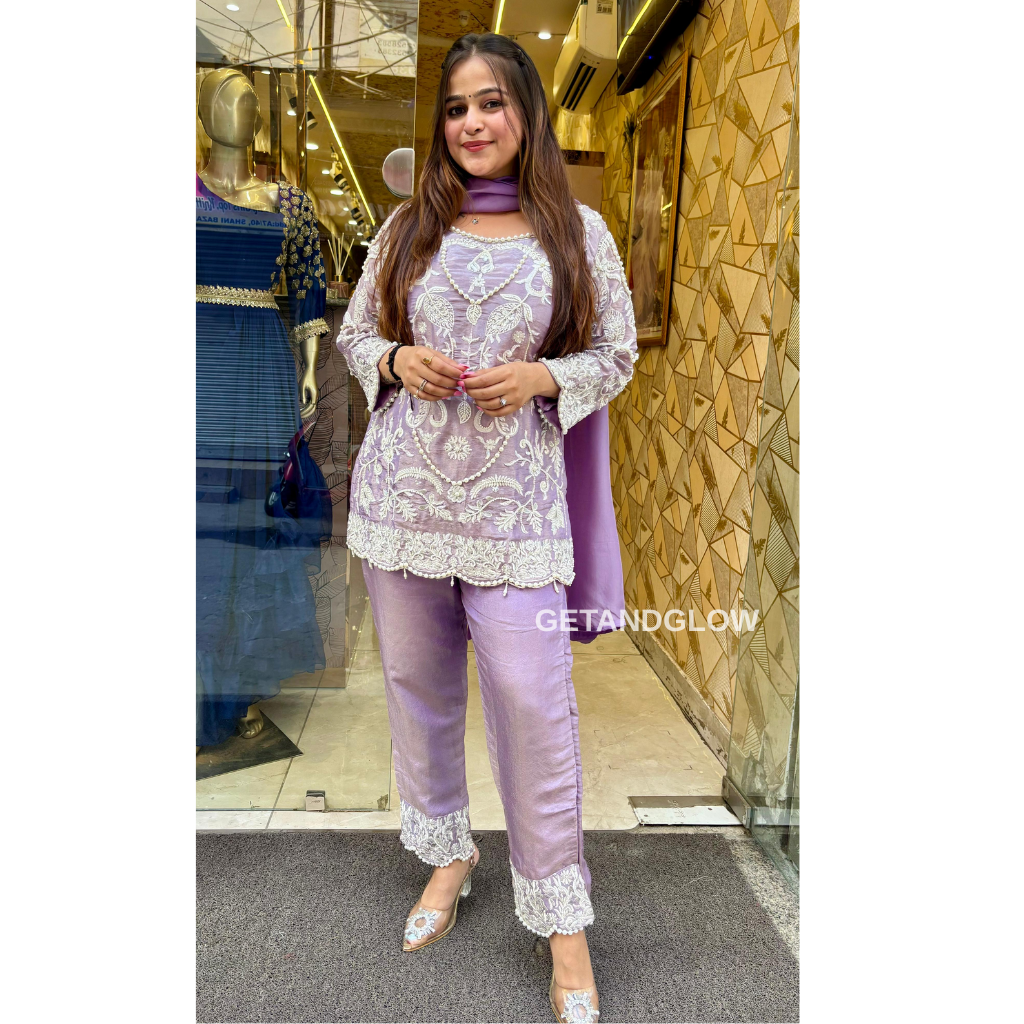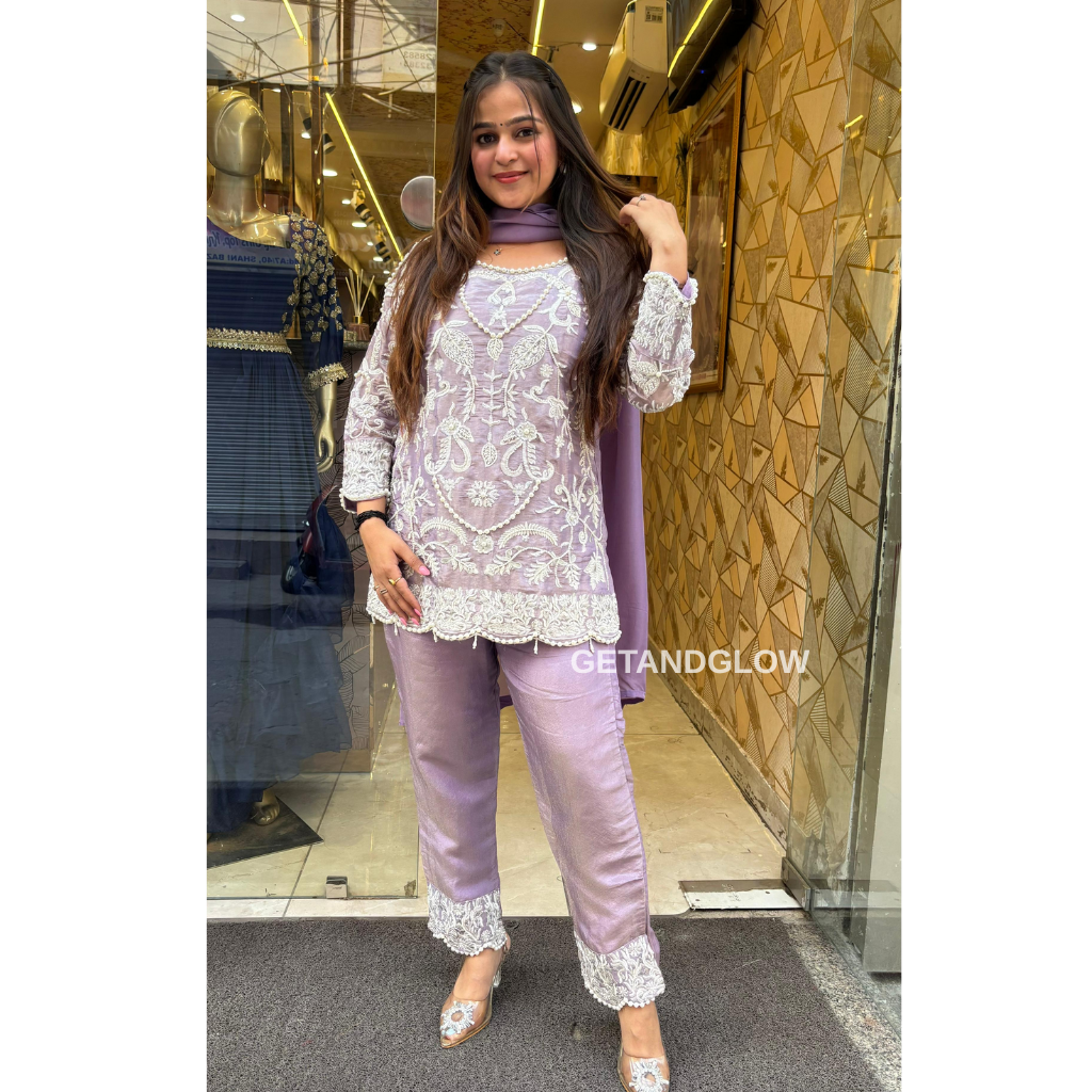 Elevate your wardrobe with the "SHAMA" Lilac Designer Suit, a perfect blend of elegance and contemporary style. Crafted with exquisite detailing, this suit offers a flattering fit and a soothing lilac hue that enhances your natural grace. Ideal for festive occasions or special gatherings, it promises comfort without compromising on sophistication. Make a statement effortlessly with this timeless designer piece.