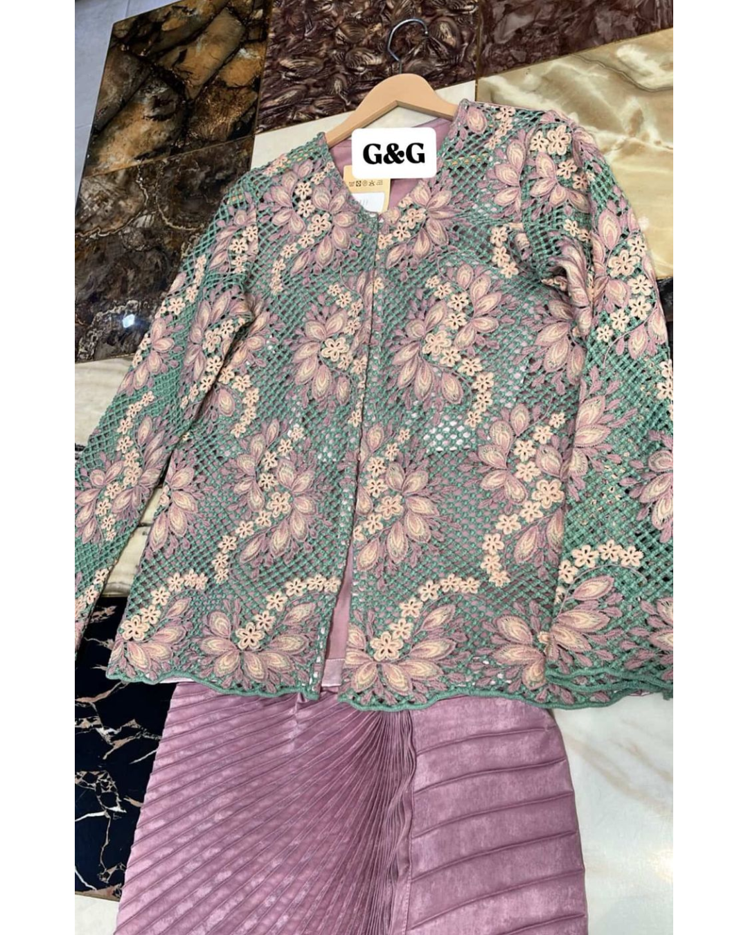 - crochet jacket with blouse and pleated skirt