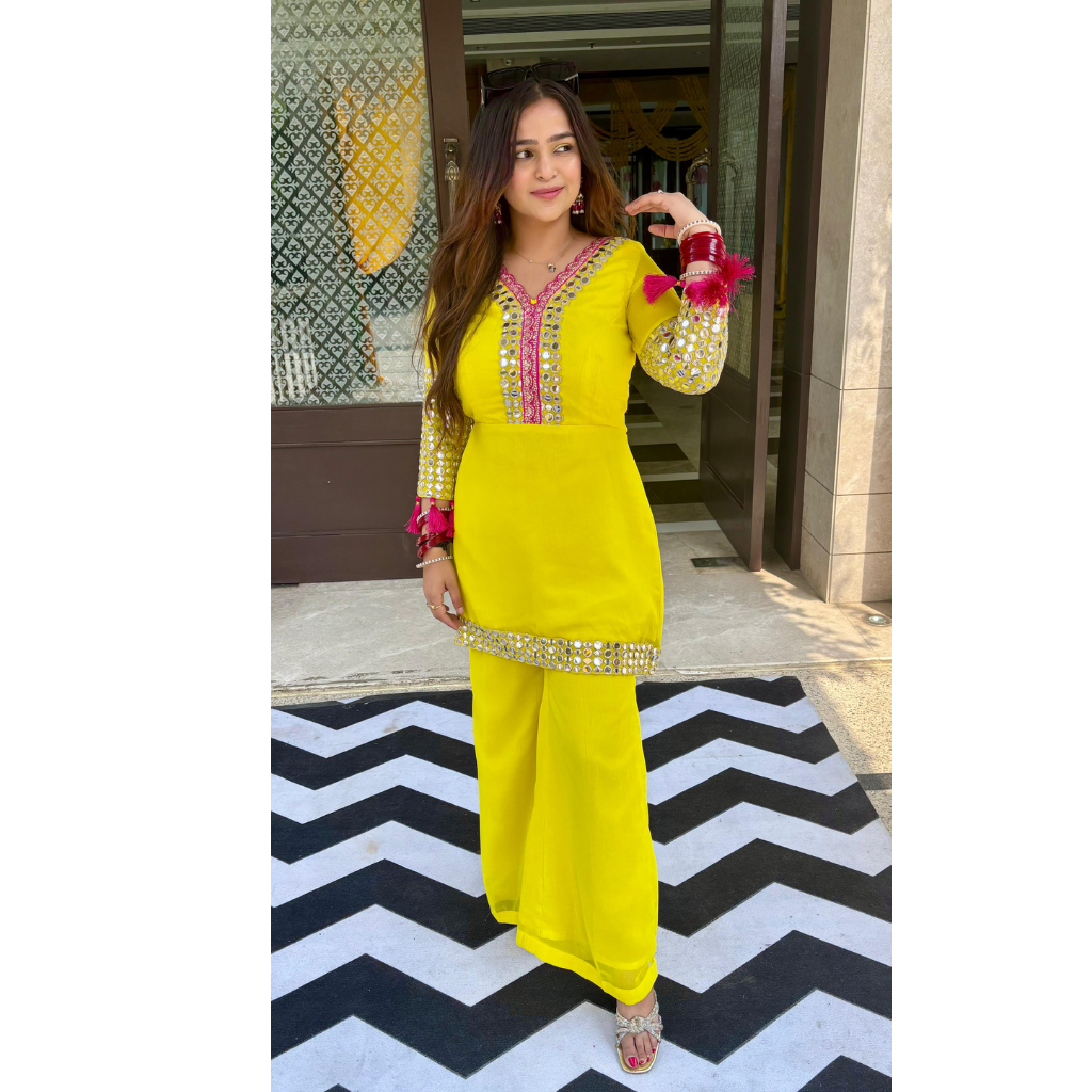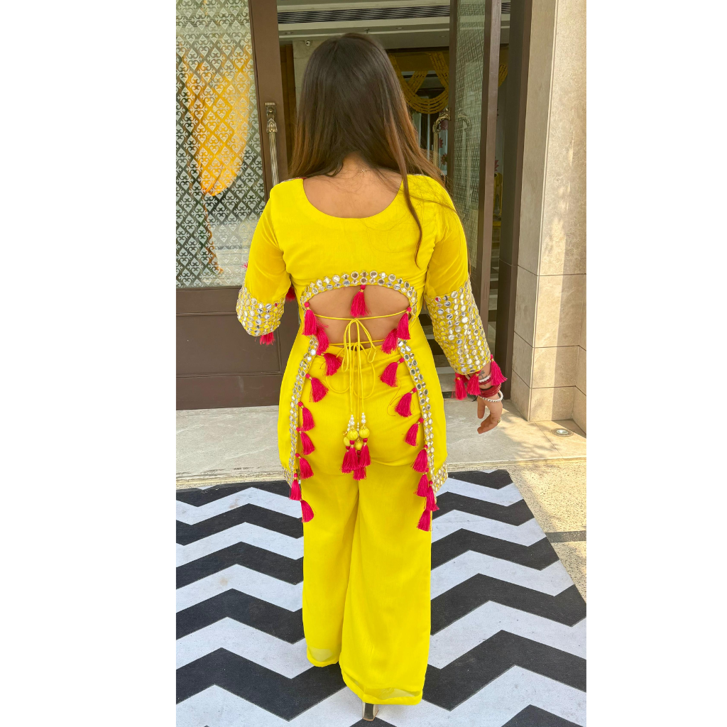 Fabric - Georgette, Mirror work detailing , can be made in any size, tassel detailing.