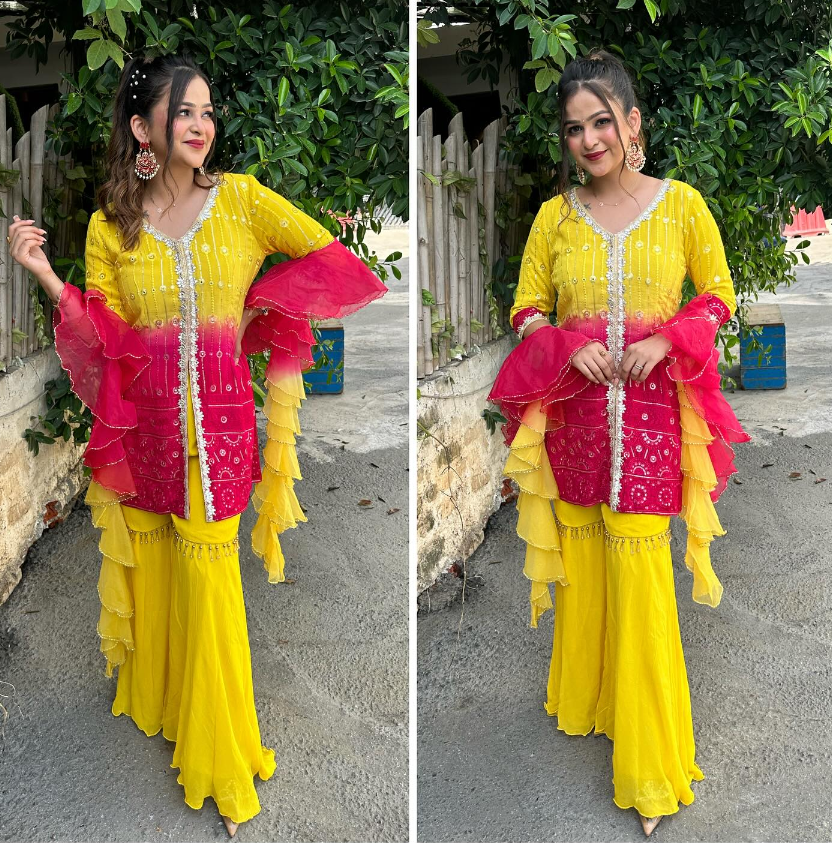 Fabric - lucknawi Blouse with palazzo + Ruffle dupatta .