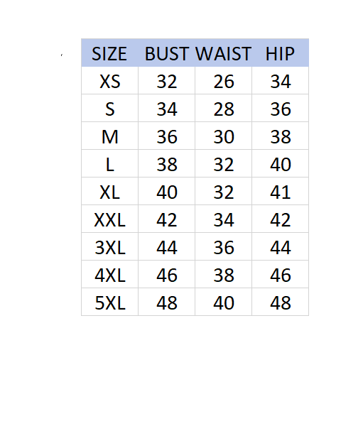 Sizes - XS S M L XL XXL 3XL 4XL 5XL